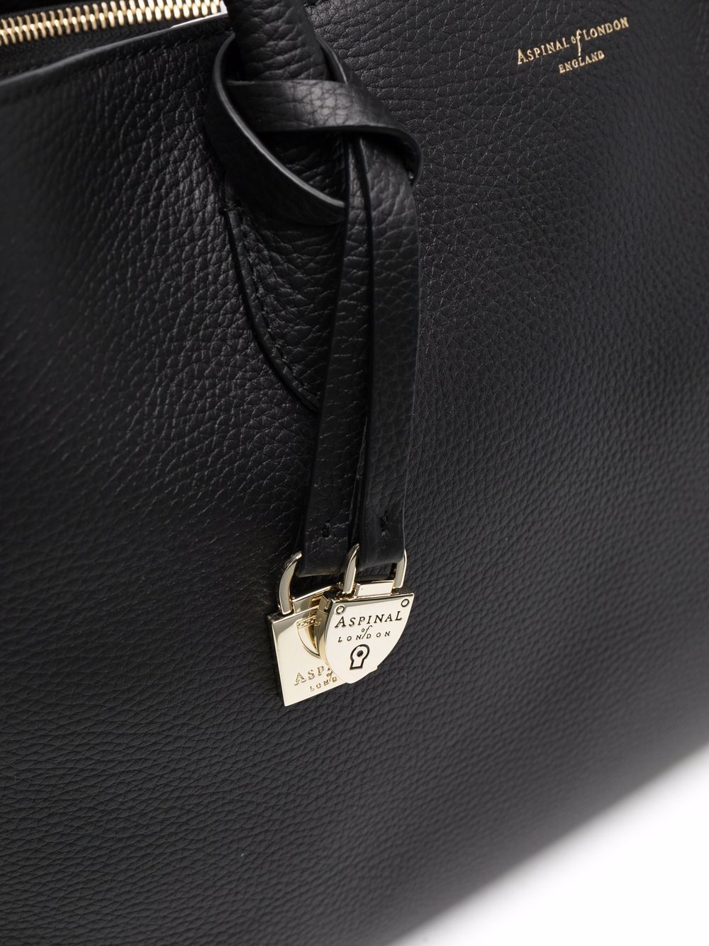 Кожаная сумка-тоут Aspinal Of LondonLondonчерная кожаная шагреневая текстура с выгравированным логотипом, подвеской-логотипом, магнитная застежка, две закругленные верхние ручки, разделенное отделение, внутренний карман на молнии, полная подкладка, импортный