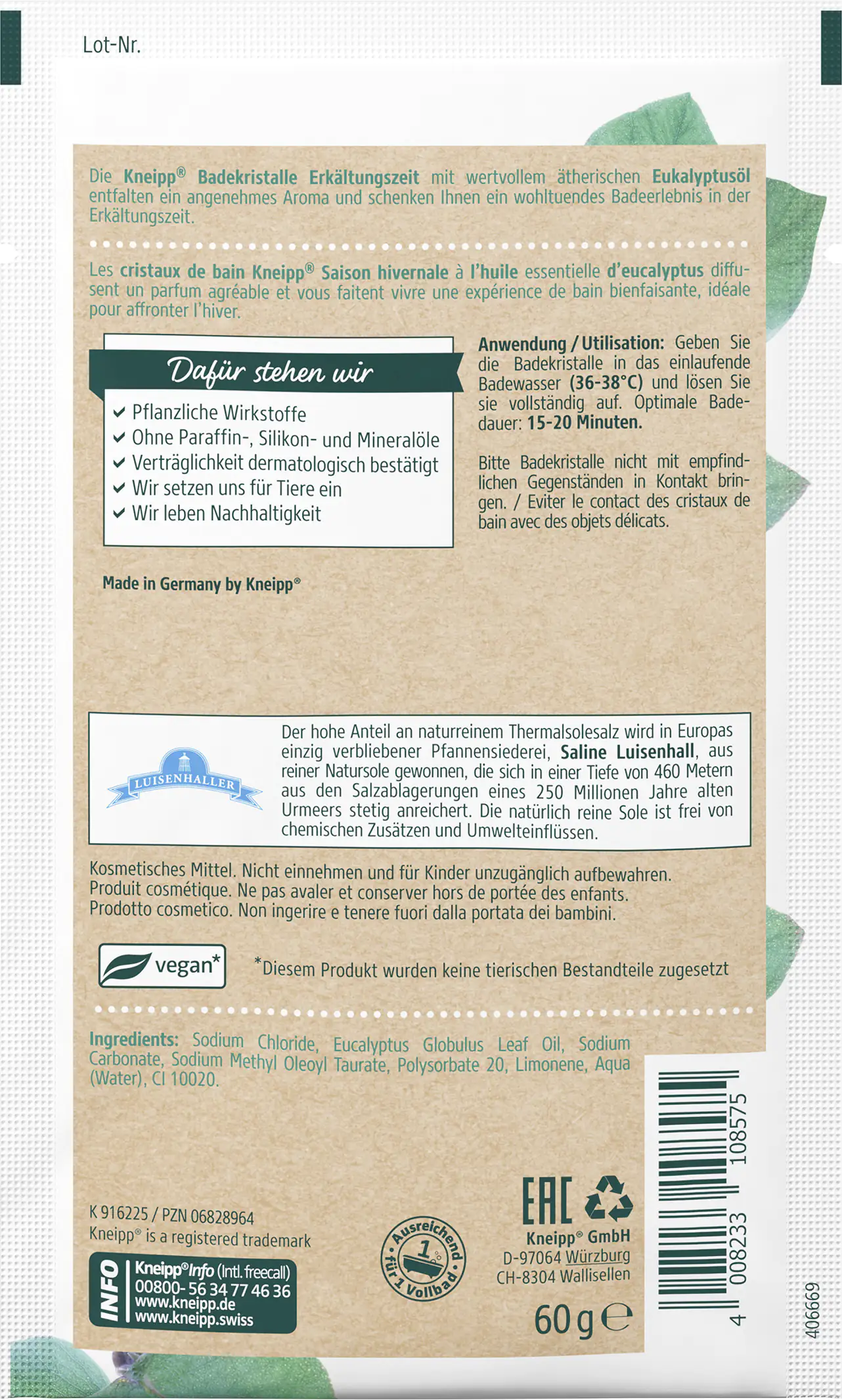 Кристаллы для купания Kneipp холодным временем с ценным важным эвкалиптовым маслом разворачивают приятный аромат и дают им успокаивающий опыт купания в случае риска простуды. Кристаллы купания Kneipp содержат высокую долю натуральной тепловой соли. Это получено в единственной оставшейся в Европе сковороде, физиологического раствора Луисенхолл, изготовленного из чистых природных подошва, которая неуклонно накапливается на глубине 460 метров от солевых отложений 250 миллионов лет Прайвл -моря. Естественно чистый рассол не содержит химических добавок и воздействия на окружающую среду.